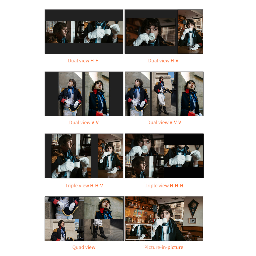Horizontálne a vertikálne monitorovanie Ako priekopník v oblasti vertikálnych obrazoviek, Desview vybavil modely OL14/OL16 ôsmimi režimami monitorovania (jednoduchý, dvojitý, trojitý a štvoritý rozdelený obraz), podporuje voľné horizontálne a vertikálne prepínanie a nahrádza viacero tradičných monitorov jedným zariadením, ktoré je ideálne pre vertikálne krátke drámy, krátke videá a živé prenosy. |