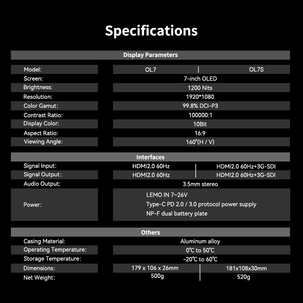 Desview OL7S je 7-palcový monitor OLED s jasom 1200 nitov, kontrastným pomerom 100 000:1 a 10-bitovou farebnou hĺbkou (1,07 miliardy farieb). Vďaka vstupom/výstupom 4K60p HDMI a 3G-SDI zabezpečuje bezproblémovú integráciu do profesionálnych pracovných postupov vysielania a filmovej tvorby.