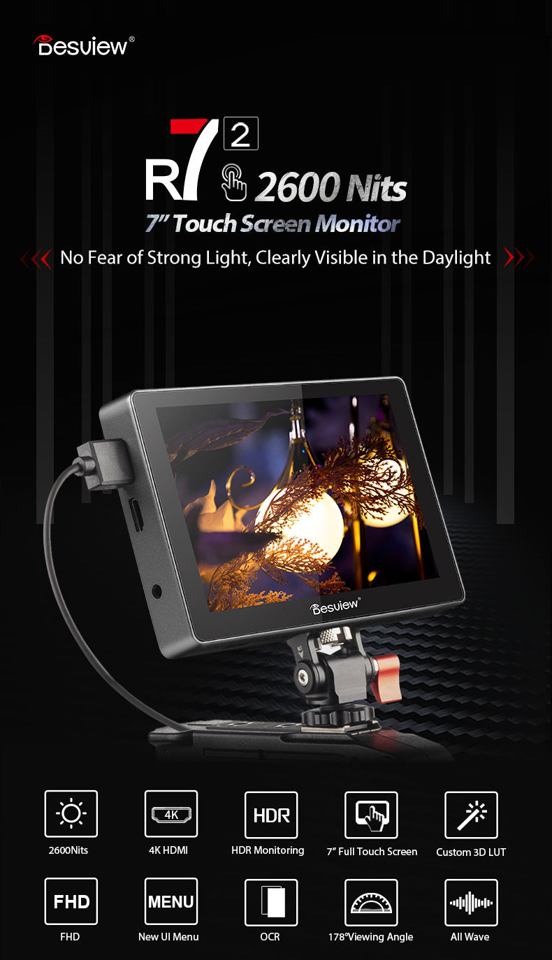Ľahký 7" dotykový monitor R72 s rozlíšením 4K HDMI od spoločnosti Desview poskytuje profesionálne monitorovanie na ostrom 7" displeji IPS LCD s rozlíšením 1920 x 1200, aktualizovaným jasom 2600 cd/m², kontrastným pomerom 1100:1 a dotykovým ovládaním spolu s kolieskom na posúvanie ponuky. Aktualizovaný jas ešte viac uľahčuje jasné sledovanie záberov pri jasnom slnečnom svetle.