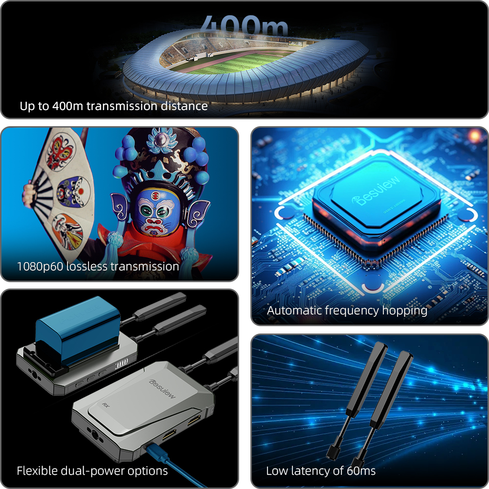 Všetko v jednom porte, rýchle nastavenie Plug-and-Play vstup signálu:Vysielač má HDMI vstup a HDMI výstup, takže môžete ľahko pripojiť fotoaparát alebo bezzrkadlový fotoaparát a udržiavať lokálne monitorovanie pre jednoduché rámovanie.