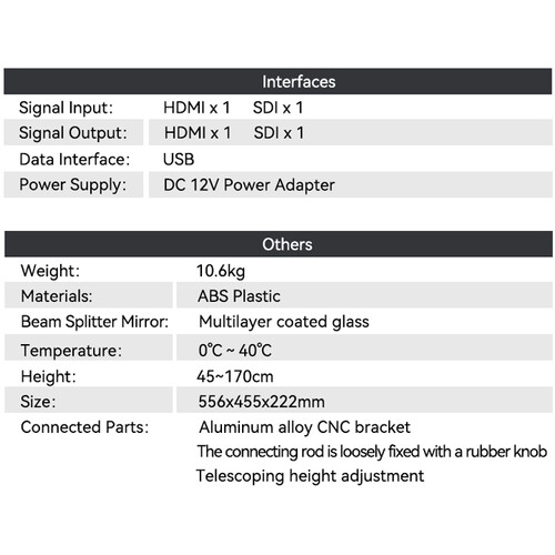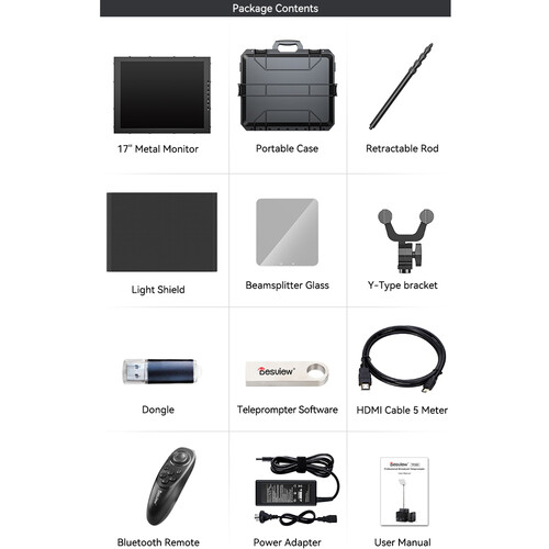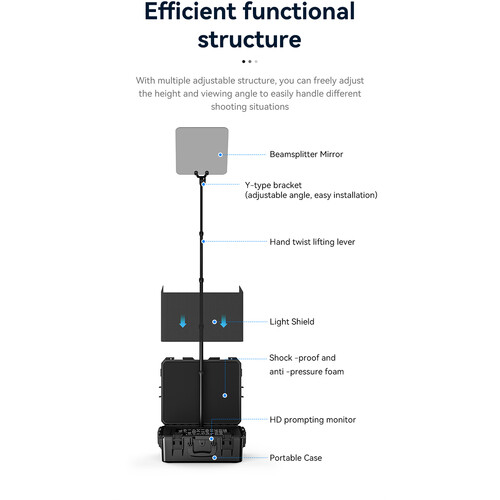 Desview TP200 je profesionálny 17-palcový teleprompter s vysokým jasom, displejom s rozlíšením 1000 cd/m², 22-palcovým zrkadlovým sklom a rozlíšením 1280 x 1024 pre jasné a ľahko čitateľné písmo. Tento teleprompter s pripojením HDMI, SDI a USB-A, výškovo nastaviteľnou tyčou a pevným puzdrom, ktoré slúži ako stojan, je ideálny na produkciu v štúdiu aj v teréne. Súčasťou je softvér na tvorbu nápovedy, diaľkový ovládač Bluetooth a slnečná clona.