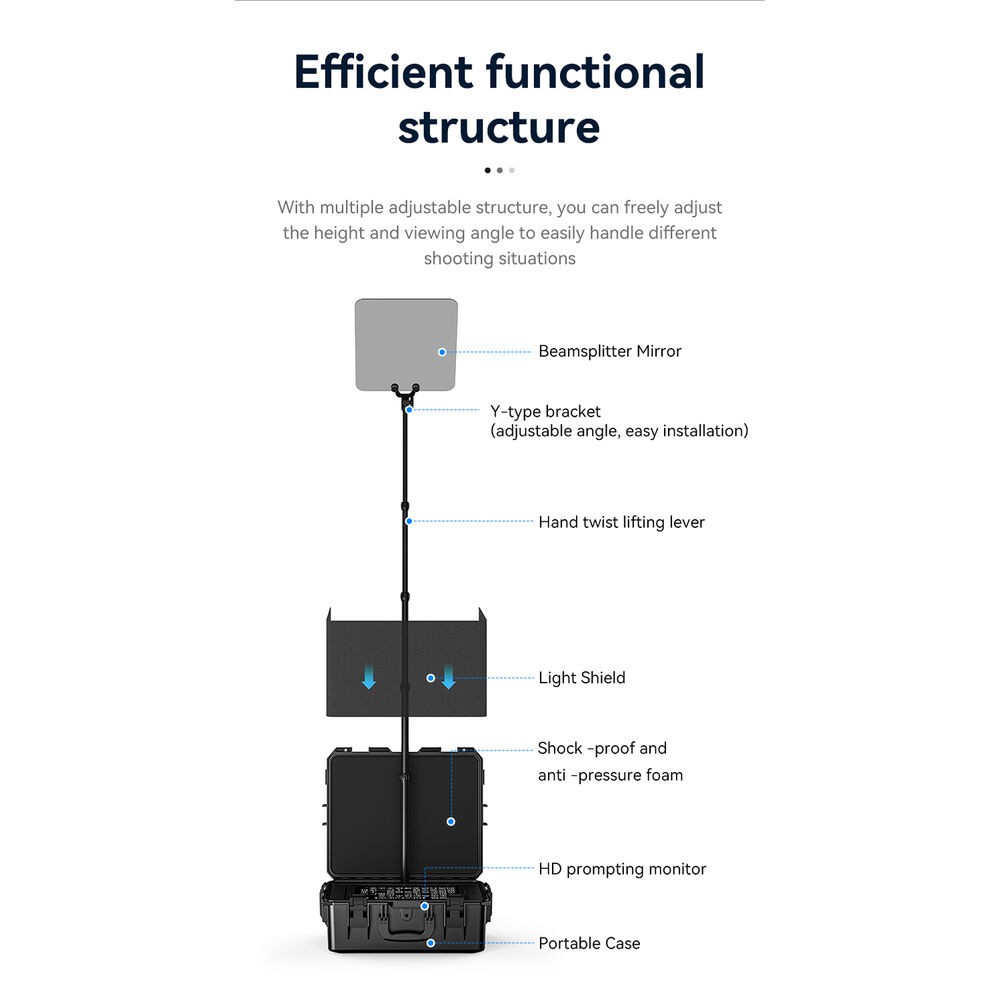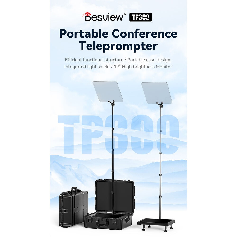 Desview TP300 je prenosný teleprompterový systém prezidentského štýlu určený na prejavy, konferencie a živé prezentácie, vybavený 19-palcovým monitorom s vysokým jasom a odrazovým zrkadlovým sklom pre jasný a prirodzený očný kontakt s publikom za akýchkoľvek svetelných podmienok.
