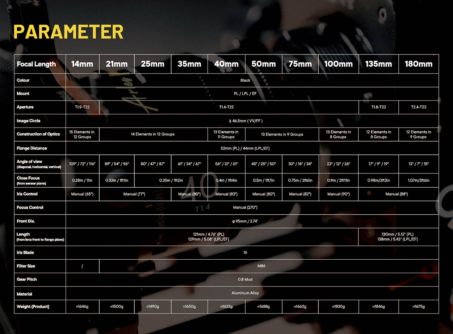 | F-stop | T/1,9-T/22 | T/1,4-T/22 | T/1,8-T/22 | T/2,4-T/22 | |