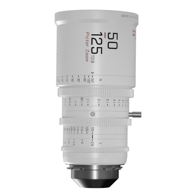 Parfokálny filmový objektív DZO Pictor 50-125 mm T2,8 pokrýva snímače formátu Super 35 / APS-C, ponúka svetelnosť T2,8 v celom rozsahu ohniskových vzdialeností a dodáva sa s vymeniteľnými bajonetmi PL a EF. Konštrukcia objektívu prakticky eliminuje dýchanie a zaručuje ostrú kresbu v celom rozsahu a pekné vykreslenie scény mimo hĺbky ostrosti vďaka 16-násobnej clone. Prstence zaostrovania, clony a zoomu sú samozrejme vrúbkované na jednoduché diaľkové ovládanie so systémami bočného zaostrovania (M0.8; pohyb zaostrovacieho prstenca 270°). Predný priemer je štandardný 95 mm pre bežné kompendiá, závit filtra je 86 mm. K dispozícii je aj nožička na podopretie objektívu v súprave. Biela verzia. Hmotnosť približne 1700 g. Pre bajonety PL a EF.
