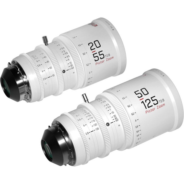 Parfokálne filmové objektívy DZO Pictor 50-125 mm T2,8 a 20-55 mm T2,8 pokrývajú snímače formátu Super 35 / APS-C, ponúkajú svetelnosť T2,8 v celom rozsahu ohniskových vzdialeností a dodávajú sa s vymeniteľnými bajonetmi PL a EF. Konštrukcia objektívov prakticky eliminuje dýchanie a zaručuje ostrú kresbu v celom rozsahu, ako aj pekné vykreslenie scény mimo hĺbky ostrosti vďaka 16 lamelovej clone. Prstence zaostrovania, clony a zoomu sú samozrejme vrúbkované na jednoduché diaľkové ovládanie pomocou systémov bočného zaostrovania (M0,8; pohyb zaostrovacieho prstenca 270°). Priemer prednej časti je štandardných 95 mm pre bežné kompakty, filtrový závit je 86 mm. K dispozícii je aj nožička na podopretie objektívu vo výstroji. Hmotnosť približne 1700 g (50-125 mm ), resp. 1520 g (20-55 mm).