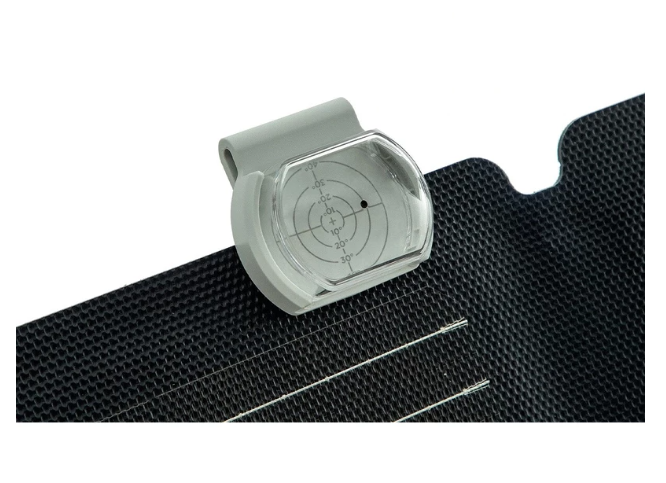 Sprievodca uhlom slnečného žiarenia EcoFlow (1ECOSAG) je navrhnutý tak, aby vám pomohol efektívne využívať slnečnú energiu tým, že udržiava vaše solárne panely perfektne zarovnané so slnečným žiarením. Vďaka kompaktnému a ľahkému dizajnu (50 × 54 × 30 mm, 25 g) sa tento sprievodca ľahko pripne na okraj akéhokoľvek solárneho panelu. Stačí nastaviť panel tak, aby slnko svietilo cez priehľadný kryt, a prispôsobiť ho, kým tieň nedosiahne stred vodítka. Tým sa zabezpečí, že panel bude kolmo na slnečné lúče, čím sa maximalizuje solárny zisk a skráti sa doba nabíjania.