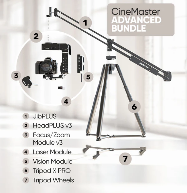 Edelkrone CineMaster Bundle - Advanced ponúka kompletný systém riadenia pohybu vrátane JibPLUS, HeadPLUS v3, modulu zaostrovania/zoomu, modulu videnia, laserového modulu, statívu X PRO a statívových koliesok. Poskytuje presné, filmové pohyby kamery pre profesionálov, ktorých cieľom je vytvárať úchvatné zábery s ľahkosťou a flexibilitou.