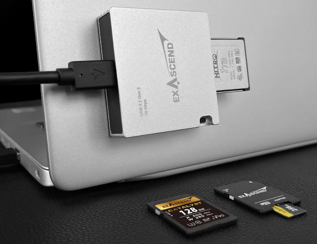Čítačka kariet Exascend EXCRFBS1 Essential 4-in-1 Multi-slot podporuje karty CFexpress Type B, SD/SD Express a microSD (s adaptérom) s rýchlosťou až 10 Gbps USB 3.2. Tenký hliníkový dizajn s magnetickým uchytením, vrátane hybridných káblov a adaptéra – ideálny pre prenosné vysokorýchlostné pracovné postupy.