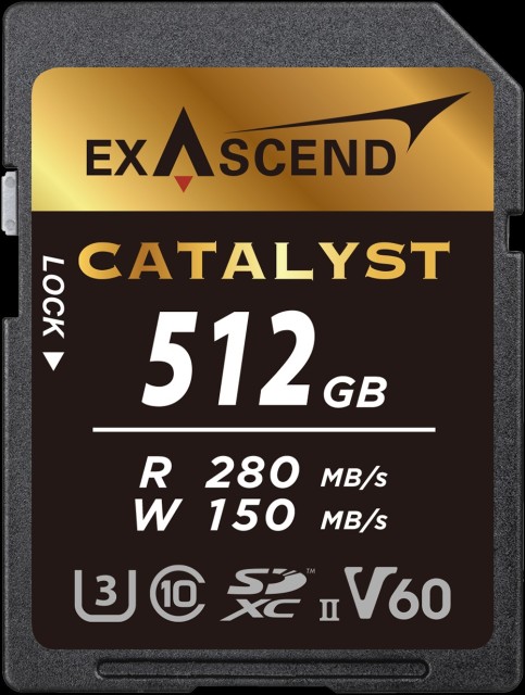 Pamäťová karta Catalyst UHS-II SDXC s kapacitou 512 GB od spoločnosti Exascend je optimalizovaná na dosiahnutie vynikajúcich výsledkov v modernej fotografii a kinematografii a umožňuje rýchle nahrávanie a nahrávanie záznamov, dokonca aj pri práci s extrémnymi dátovými tokmi, čím pomáha zabezpečiť, aby nedochádzalo k výpadkom snímok. Táto karta má úložnú kapacitu 512 GB a využíva zbernicu UHS-II na dosiahnutie maximálnej rýchlosti sekvenčného čítania 280 MB/s a maximálnej rýchlosti sekvenčného zápisu 150 MB/s. Vďaka zaradeniu do rýchlostnej triedy V60 je zaručené, že minimálne rýchlosti zápisu neklesnú pod 60 MB/s.
