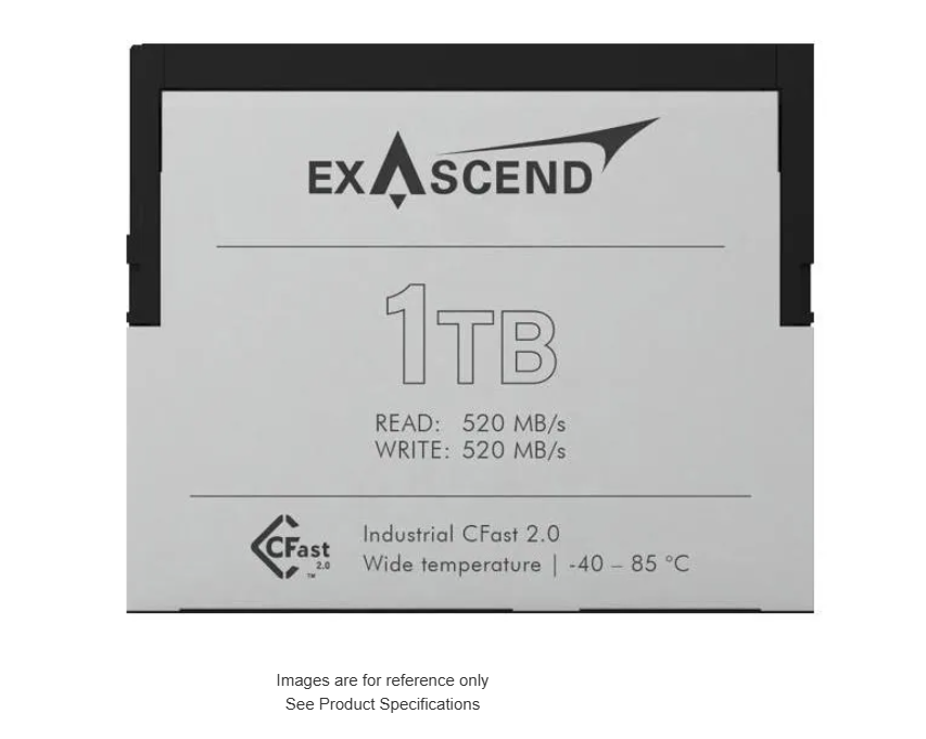 Karta Exascend 512 GB CFast 2.0 (séria SD3X) poskytuje trvalú rýchlosť čítania 520 MB/s a rýchlosť zápisu 400 MB/s prostredníctvom rozhrania SATA III s 3D TLC NAND. Pracuje pri napätí 3,3 V v teplotnom rozsahu od -40 °C do +85 °C, má rozmery 42,8 x 36,4 x 3,6 mm a je ideálna pre vysokokapacitné priemyselné 4K/8K video, sledovacie a vstavané systémy.