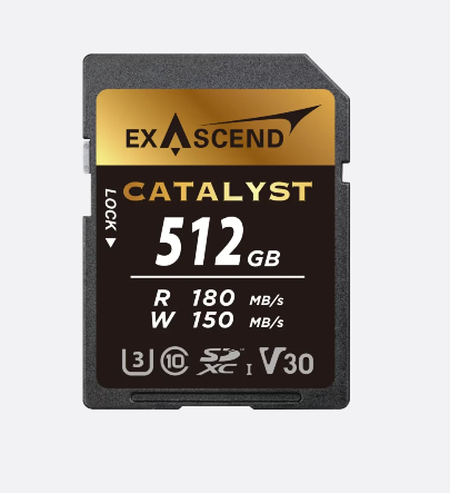 Karta Exascend EX512GSDU1 512 GB Catalyst UHS-I SDXC má certifikáciu V30 pre 4K/8K video, rýchlosť čítania 180 MB/s, rýchlosť zápisu 150 MB/s, 3D TLC, odolnosť voči teplotám od -25 °C do 85 °C, odolnosť voči vode/prachu/nárazom, ideálna pre profesionálnu fotografiu v extrémnych podmienkach.