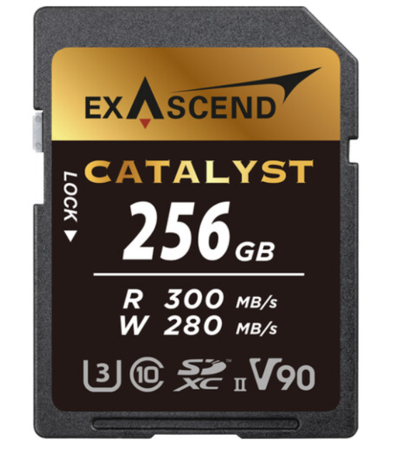 Karta Exascend EX256GSDU2 256 GB Catalyst UHS-II SD ponúka rýchlosť čítania 300 MB/s a rýchlosť zápisu 280 MB/s (V90 garantovaná ≥90 MB/s). Odolná konštrukcia odolná voči poveternostným vplyvom vydrží teploty od -13 do 185 °F, vodu, prach a je ideálna pre 8K/6K kinematografiu a fotografovanie s vysokou bitovou rýchlosťou bez straty snímok.