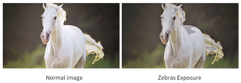 Expozícia sa používa ako pomôcka na nastavenie expozície v režime obrazca Zebra. Považuje sa za preexponovanú a na preexponovanej oblasti sa zobrazujú pohyblivé výstražné čiary. K dispozícii je hodnota zebry v rozsahu 1 až 100 %, ktorú možno nastaviť.