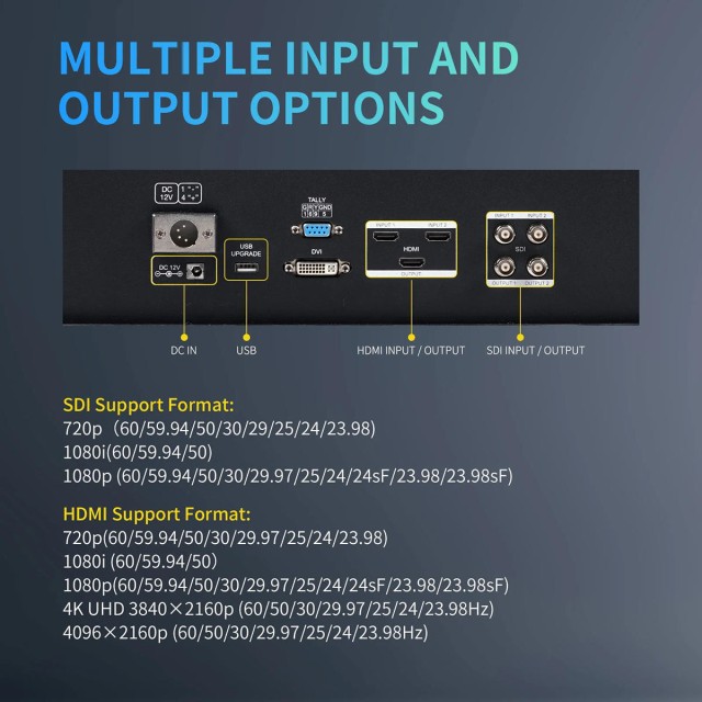 Monitor je vybavený portami 3G-SDI, HDMI2.0 a DVI, takže je kompatibilný s profesionálnymi videokamerami a najnovšími digitálnymi bezzrkadlovkami.