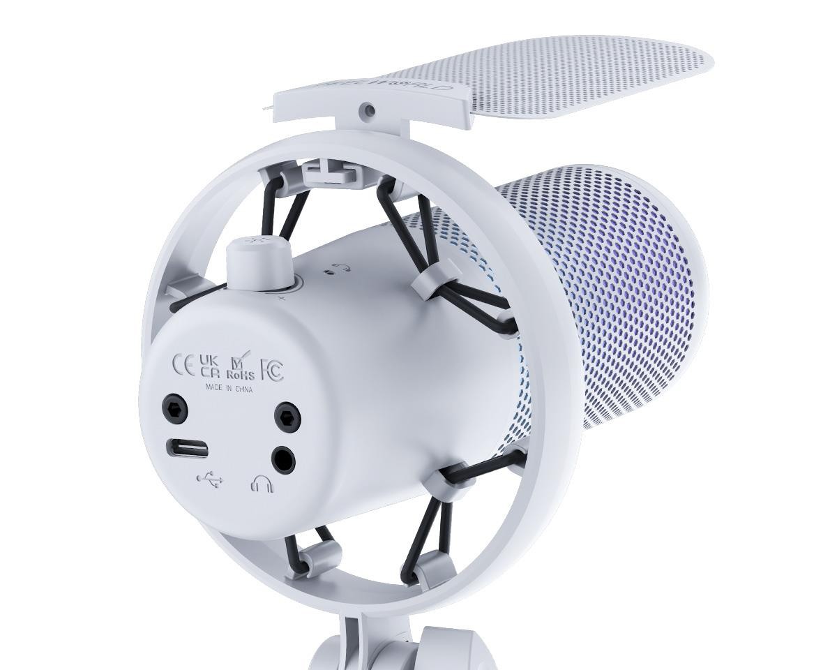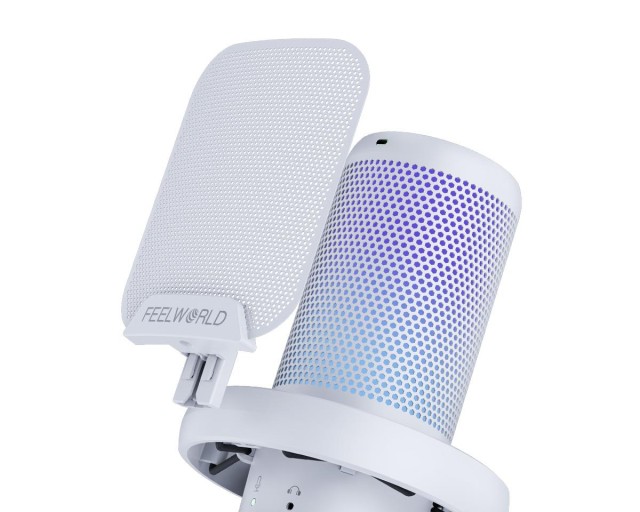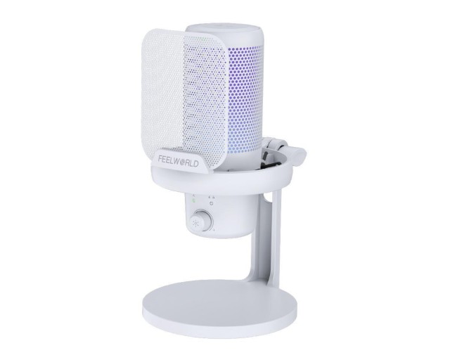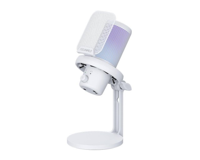 Feelworld VM1-XS-W je kondenzátorový mikrofón USB typu plug-and-play s čistým bielym povrchom, ideálny na streamovanie, hranie hier a podcasting. Disponuje kardioidnou charakteristikou pre čistý zvuk, špeciálnym tlačidlom na stlmenie/odstránenie šumu, prispôsobiteľným viacmódovým RGB osvetlením a stolným stojanom, ktorý je súčasťou balenia.