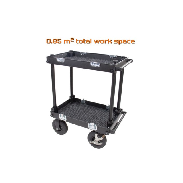 The SMARTONE MICRO double deck cart can be use to transport equipment or as a sound department cart. We applied durable materials to face the harsh on set conditions, tires are made from 4-layer gum placed on strong steel rims equipped with 2 manual foot brakes with force regulation for secure and save routing on most of surfaces, aluminum structure is lightweight and sustained enough to hold up to 200 kilograms, no tools required to attach of remove each wheel or any part of the cart what saves your time. SMARTONE MICRO is super easy to collapse and ready to use in less than 2 minutes. We developed a list of details which can improve the quality of usage like small transport wheels, props and deflects. Compact size allow the cart to transport easily all parts in one case. Only three from 220mm diameter wheels fits inside the collpased cart. We add a special bag to which you can fit the remaining wheel or all four wheels.