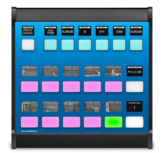 SKAARHOJ Frame Shot Pro s Blue Pill Inside (modrý) je profesionálny samostatný panel pre ovládanie PTZ kamier, vybavený 19 programovateľnými tlačidlami RGB s OLED displejmi, určený na flexibilné riadenie živých produkcií a modulárne rozširovanie.