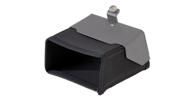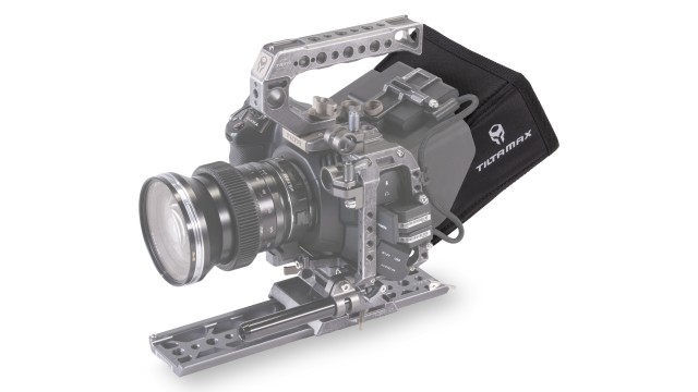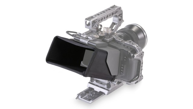 Celú slnečnú clonu možno pripojiť k čiastočnej slnečnej clone pre BMPCC 4K pomocou priložených suchých zipsov. Získate tak väčšie pokrytie slnečnou clonou. Priehradku na spodnej strane úplnej slnečnej clony možno otvoriť, aby sa umožnil prístup k dotykovému displeju fotoaparátu.