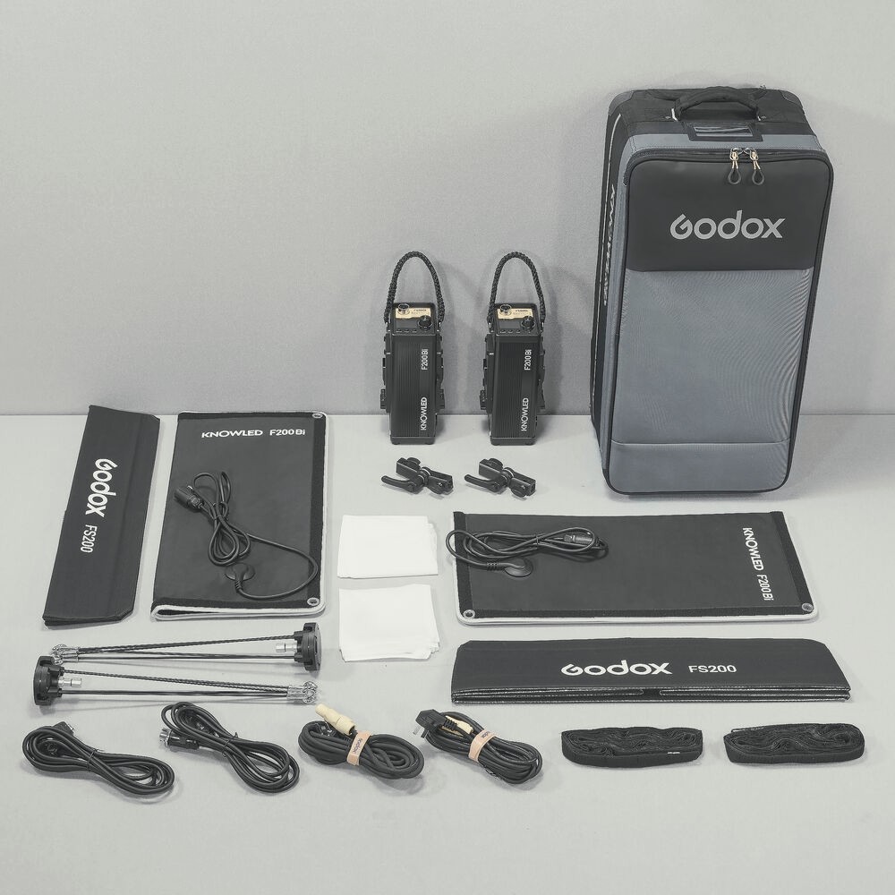 Súprava F200Bi K2 je dodávaná s softboxmi a odnímateľnými mriežkami pre jemné tvarovanie svetla, X-držiakmi a adaptérovými držiakmi pre bezpečné upevnenie, ovládačmi/napájacími jednotkami, pripojovacími a napájacími káblami a polstrovanou taškou na jednoduché prenášanie. Vďaka prémiovej kvalite konštrukcie, presnému výkonu a bezkonkurenčnej prispôsobivosti je sada Godox KNOWLED F200Bi K2 špičkovým osvetľovacím systémom pre profesionálov, ktorí potrebujú odolné, flexibilné a vysoko výkonné LED riešenie.