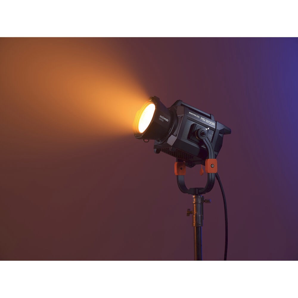 Godox Knowled MG1200R je vlajková loď medzi farebnými RGB LED svietidlami, navrhnutá pre náročné filmové, televízne a komerčné produkcie, ktoré vyžadujú špičkový výkon, hlboké ovládanie farieb a bezkompromisnú odolnosť. S impozantným výkonom 1600 W a produkciou až 21 300 luxov pri 9,8 ft s priloženým 45° reflektorom poskytuje MG1200R silný, ovládateľný lúč, ideálny pre kľúčové osvetlenie, tvrdé smerové efekty alebo osvetlenie veľkých scén.