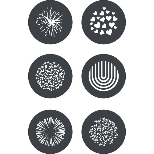 Vylepšite svoj reflektor Godox MG1200Bi pomocou sady GP-GS2 Gobo Set, ktorá obsahuje šesť oceľových gobo, ktoré premietajú kreatívne vzory, ako sú ohňostroje, slnečné lúče, srdcia a ďalšie – ideálne pre divadlo, film, módu a scénické efekty.