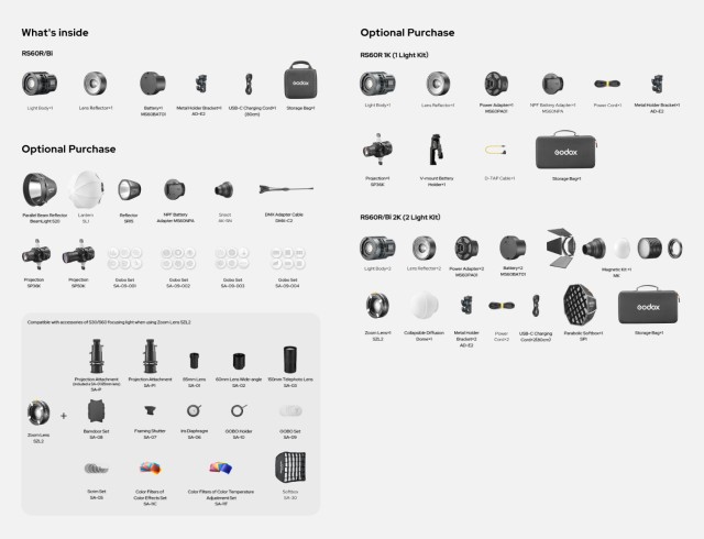 Každá sada obsahuje reflektory, držiaky, zoomový objektív, napájacie adaptéry, káble USB-C a nabíjateľné batérie, vďaka čomu je pripravená na okamžité použitie. Odolná kovová konštrukcia, ľahký dizajn a prenosné držadlá zabezpečujú jednoduchú inštaláciu a prepravu, čo je ideálne pre živé podujatia, prácu v štúdiu alebo natáčanie na mieste.