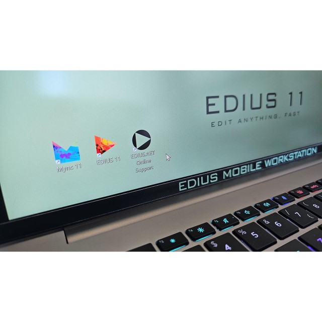 Klávesnica notebooku EDIUS Mobile Workstation ponúka farebné podsvietenie v rovnakej farebnej schéme ako profesionálna klávesnica EDIUS V2. Jednotlivé klávesové skratky sú usporiadané podľa farieb funkcií: svetlomodrá pre navigáciu, žltá pre značky, sivá pre funkcie úprav, červená pre nahrávanie a výstup, tmavomodrá pre úpravy viacerých kamier, fialová pre funkcie úprav atď. Vďaka tomu môžete so systémom EDIUS pracovať rýchlo a pohodlne, a to aj za sťažených svetelných podmienok. Klávesnica je k dispozícii s nemeckým, anglickým (US alebo UK) alebo francúzskym rozložením. Integrovaný je aj veľký touchpad s tromi tlačidlami a súčasťou balenia je aj myš Bluetooth a zodpovedajúca podložka pod myš EDIUS 11.