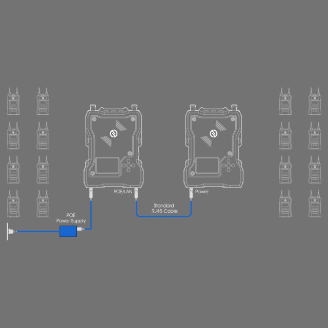 Okrem integrovanej antény (dosah až 400 m v prednej pologuli alebo 50 m v zadnej pologuli), ktorá je obzvlášť vhodná na komunikáciu na otvorených priestranstvách a v riedko zastavaných interiéroch (koncertné haly, kostoly atď.), má základňová stanica aj externé antény FRP s dosahom približne 300 m v celom rozsahu 360° (ideálne napr. pre výstavné priestory, športové štadióny atď.).