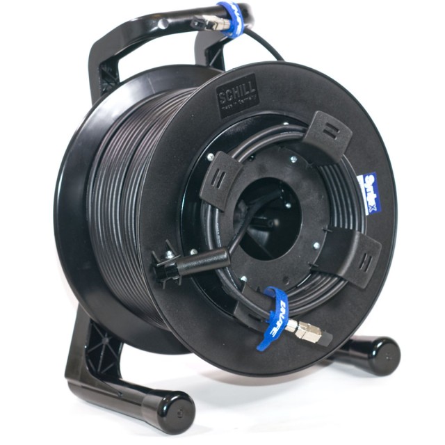 Flexibilný CAT6A STP kábel 23AWG s vonkajším priemerom 8,6 mm s koncovkami Telegartner RJ45, navinutý na káblový bubon Schill GT 380.RM. Ethernetové káble sa používajú nielen pre počítačové siete, ale tiež v poslednej dobe pre digitálne audio siete, sieťové kamery, HDBaseT prenosy. Celková dĺžka kábla je udávaná vrátane konektorov.