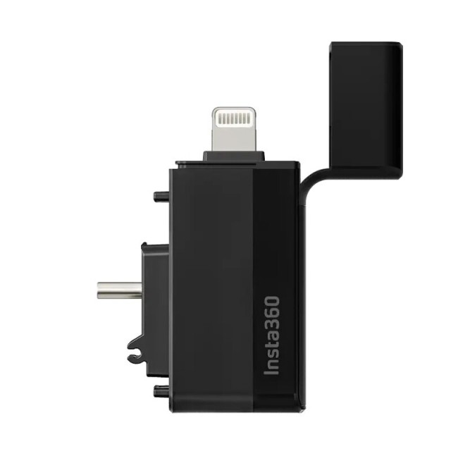 Zariadenie je vybavené modulom Plug-And-Play, ktorý umožňuje priame pripojenie k telefónu a prenos súborov bez použitia Wi-Fi. Je kompatibilný s operačnými systémami iOS a Android. Po pripojení k fotoaparátu funguje ako externý, samostatný pamäťový modul na ukladanie videí a fotografií priamo počas snímania. Pripojte čítačku k telefónu alebo tabletu pomocou konektora USB-C a upravujte súbory priamo v aplikácii Insta360.