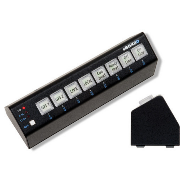 Desktopová verzia Remote Trigger pre gBox a eBox spája sBOX s gBOX (GPO Trigger Box) alebo eBOX (Quad Serial/Ethernet/GPI Interface) ako jednoduchý diaľkový ovládač na spúšťanie GPO. Okrem toho môžete s eBOXom použiť túto jednotku na spúšťanie odosielania používateľom naprogramovaných sériových alebo ethernetových správ. Tento diaľkový spúšťač je vybavený 8 tlačidlami s LED podsvietením a podsvieteným prepínačom banky, ktorý umožňuje jedným diaľkovým spúšťačom sBOX8D ovládať až 24 GPO. Viacero jednotiek diaľkového spúšťania sBOX8D (až 3) môže poskytnúť vyhradené tlačidlá až pre 24 GPO. Túto kompaktnú jednotku možno umiestniť za klávesnicu počítača.