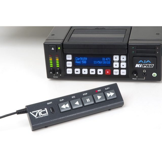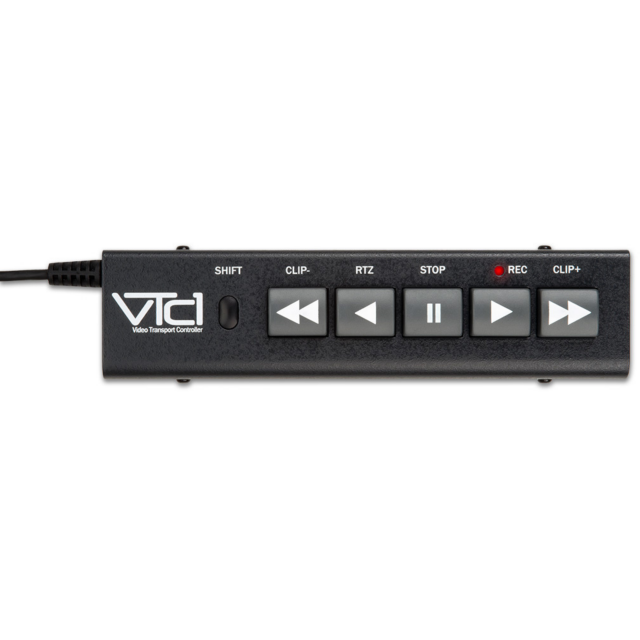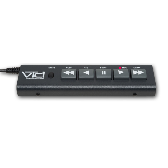 JLCooper VTC1 Video Transport Controller je kompaktný diaľkový ovládač pre záznamové zariadenia založené na súboroch, ako sú AJA Ki Pro a Blackmagic HyperDeck Studio. Viac príkladov nájdete v časti Funkcie nižšie. Vďaka integrovanému 9,8' 9-pinovému káblu RS-422 sa pripája k vášmu zariadeniu na plnú prevádzku bez potreby ďalšieho napájania. Funguje aj s väčšinou 9-pinových VTR s rozhraním RS-422. Automaticky sa nakonfiguruje tak, aby poskytoval prehliadanie klipov na zariadeniach AJA, FFV, Video Devices a vybraných ďalších dekóderoch, ktoré túto funkciu podporujú. Pre väčšinu ostatných zariadení ponúka funkcia Clip +/- skratku na preskočenie o 10 sekúnd dopredu alebo dozadu.