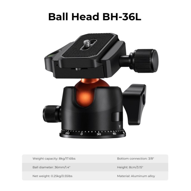 - * 【360-stupňová kovová guľová hlava】36 mm kovovú guľovú hlavu možno otáčať do ľubovoľného uhla, čo pomáha zlepšiť rozsah činnosti fotoaparátu počas panorámovania. 360-stupňový otočný volič umožňuje nastaviť presné zábery na zachytenie krásy krajiny.