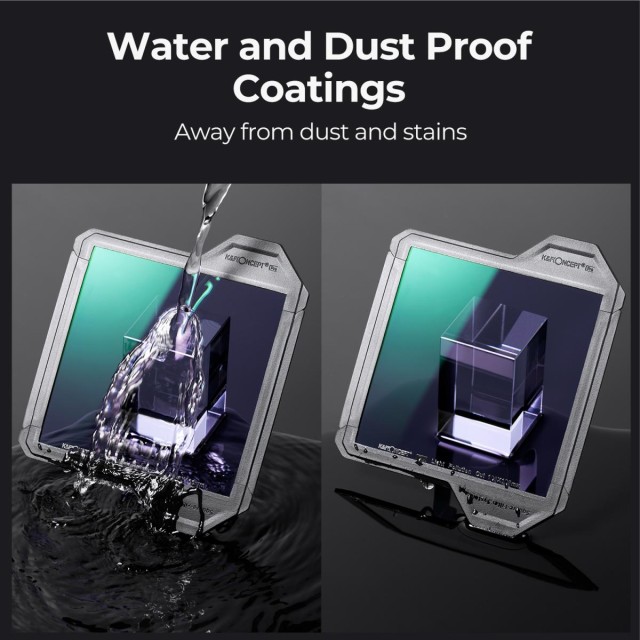 - * Ochranný rám K&F Concept Pro získal ocenenie iF DESIGN AWARD a Red Dot Design Award. Štvorcový rám filtra dokáže ochrániť objektív pred náhodným pádom a nerozbije sa (pri páde z výšky 1,5 metra na rovnú zem sa nerozbije, pozn.)