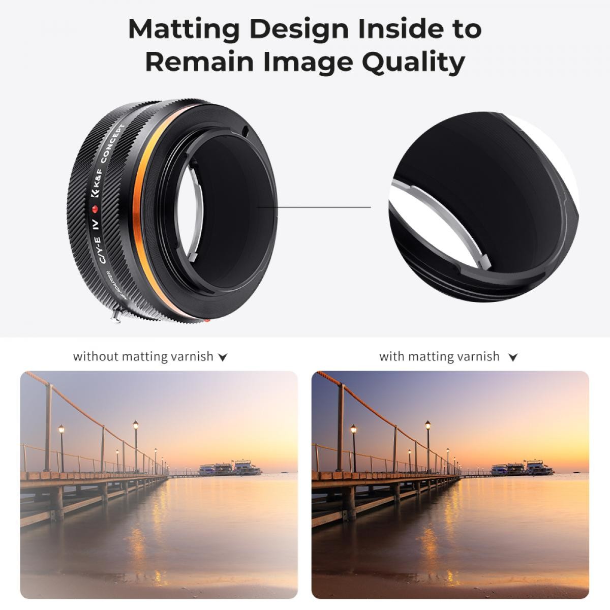 Baionetový bajonet štvrtej generácie má vroubkovaný dizajn a kľúčové body majú protiskluzovú úpravu pre ľahké uchopenie. Jemné CNC gravírovanie tiež zvyšuje estetickú kvalitu a textúru. Matná čierna vnútorná povrchová úprava znižuje odlesky a odrazy svetla prechádzajúceho objektívom, čím vám poskytuje perfektný záber s presnou expozíciou.