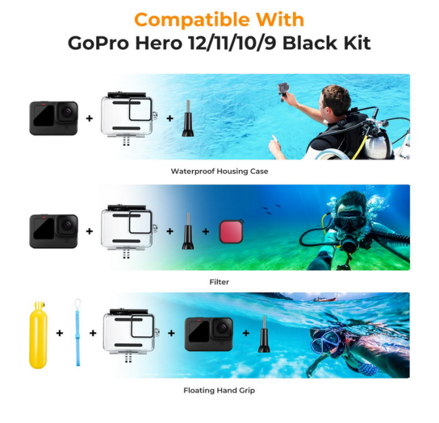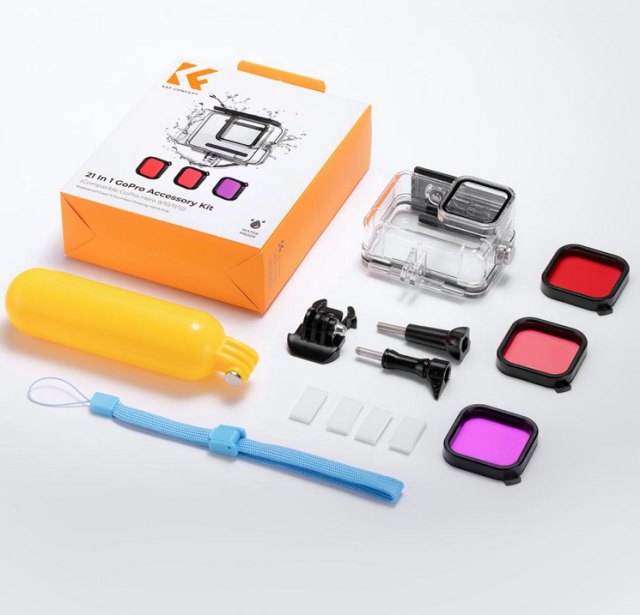 Vodotesná súprava K&F 21 v 1 je špeciálne navrhnutá pre kamery GoPro Hero 12, 11, 10 a 9 Black a poskytuje komplexnú ochranu a všestranné príslušenstvo pre podvodné dobrodružstvá. Táto súprava obsahuje vodotesné puzdro, ktoré podporuje hĺbku až do 147 stôp, sadu potápačských filtrov na korekciu farieb a plávajúcu rukoväť na lepšie ovládanie a prevenciu straty. Zabezpečí, že vaša akčná kamera zostane bezpečná a funkčná počas plávania, surfovania, potápania, šnorchlovania a iných vodných aktivít.
