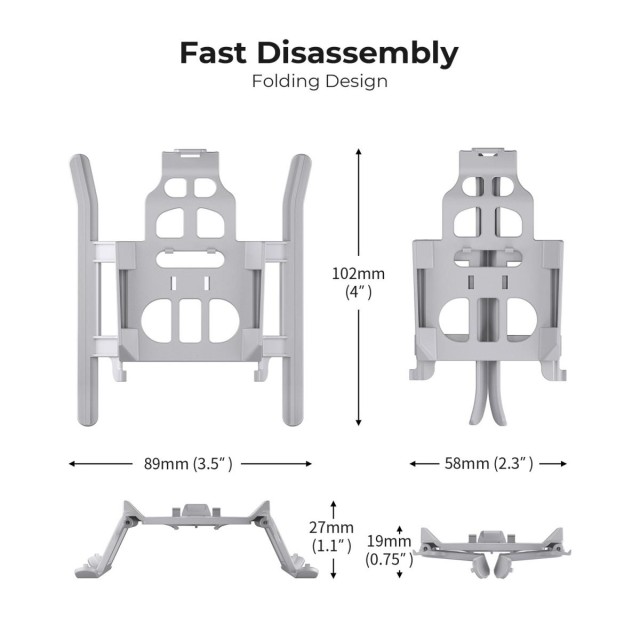 Zvýšený podvozok zvyšuje vzdialenosť medzi trupom dronu a zemou, čím pomáha zabrániť znečisteniu tela alebo poškodeniu gimbalu a kamery počas štartu a pristátia nečistotami, prachom a úlomkami. Jeho ľahká, ale pevná konštrukcia zaisťuje, že zostane pevne pripevnený bez vplyvu na letové vlastnosti.