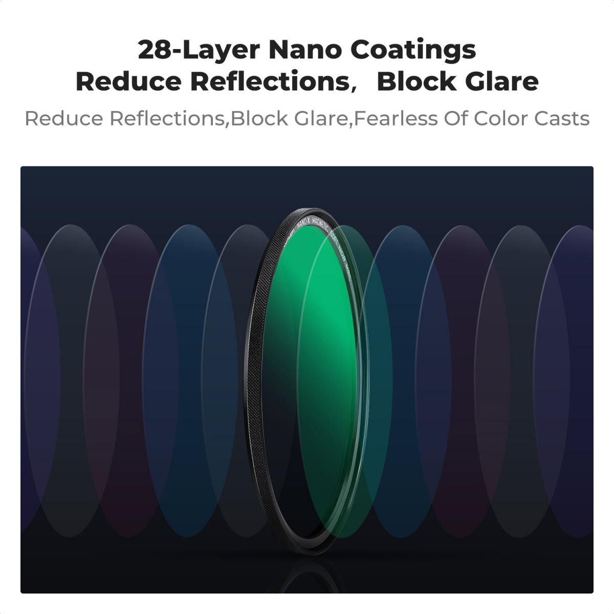Všetky filtre sú vyrobené z importovaného optického skla AGC s vysokým rozlíšením s 28-vrstvovým nano/multi-povlakom, vďaka čomu sú vodotesné, odolné proti poškriabaniu, odolné proti oleju a farebne presné. Ultra tenký CNC frézovaný rám (1,9–3,33 mm) zabraňuje vinetácii na širokouhlých objektívoch a zároveň zabezpečuje jednoduchú inštaláciu a demontáž. Súčasťou balenia je kompaktné puzdro na filtre pre prenosnosť a ochranu.