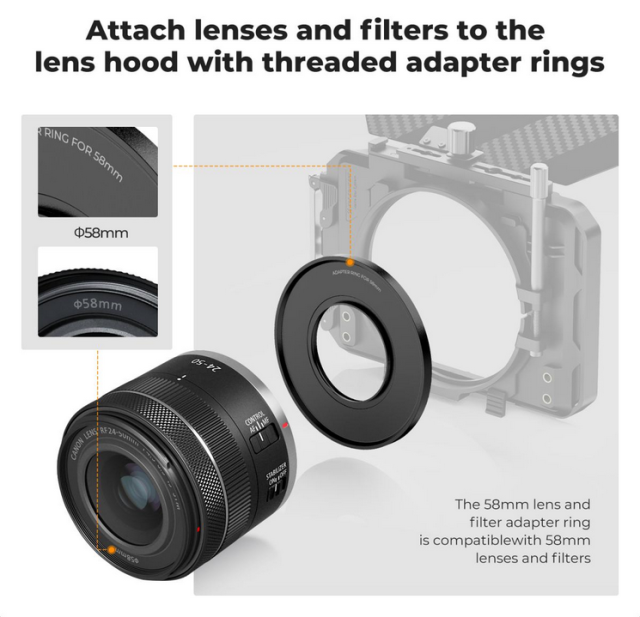 Adaptačný krúžok pre matný box K&F 58 mm, vyrobený z hliníkovej zliatiny leteckej kvality, zaručuje odolnosť, stabilitu a presné uchytenie pre matné boxy K&F Concept, čím sa ľahko zvyšuje kvalita snímania.