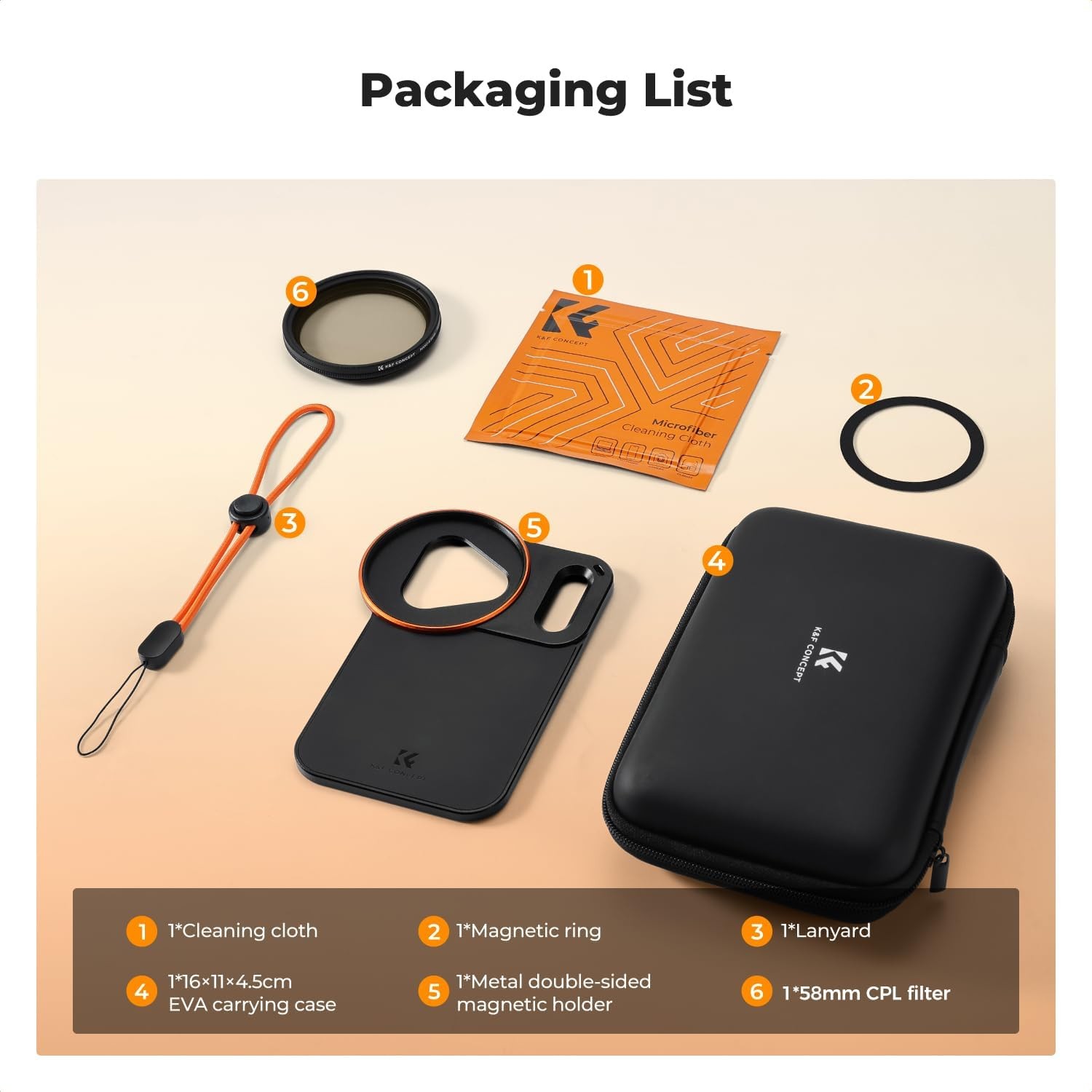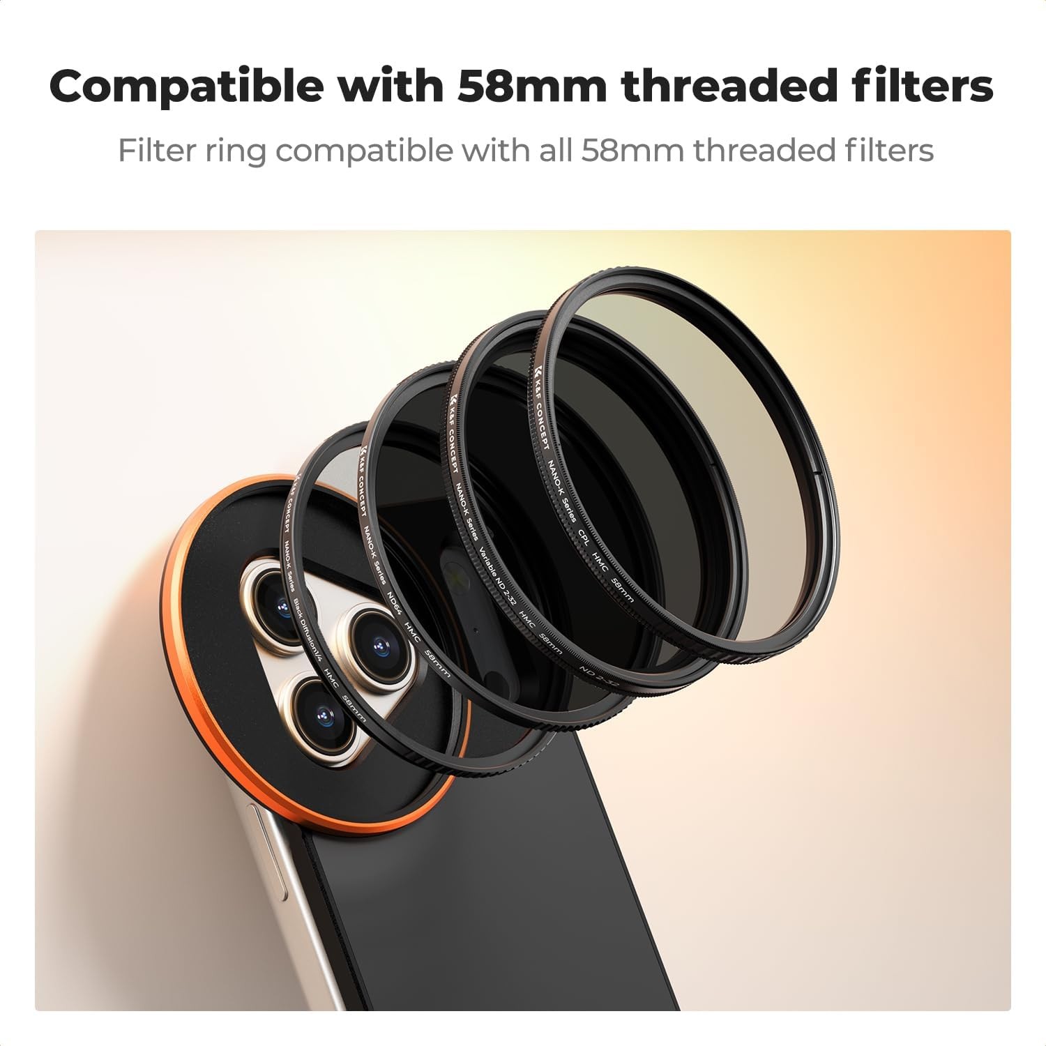 K&F 58 mm skrutkovateľný obojstranný magnetický držiak filtra Magsafe pre iPhone 17 Pro Max umožňuje bezpečné pripevnenie CPL a iných 58 mm filtrov. Je vybavený silnými obojstrannými magnetmi, presným uchytením a komplexnou ochranou pre stabilnú a kreatívnu mobilnú fotografiu.