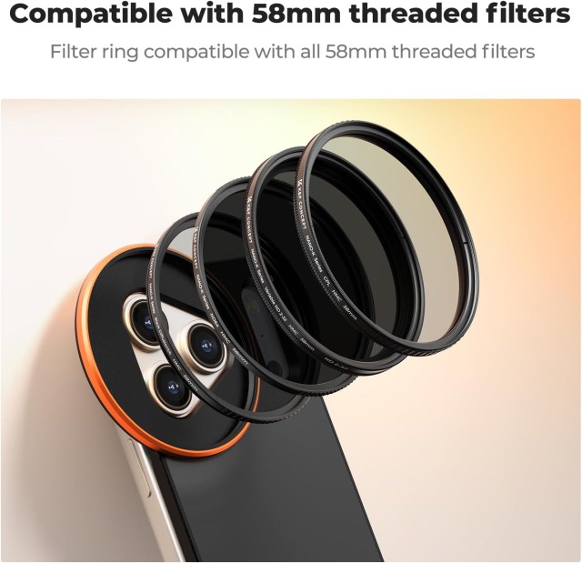 Univerzálny 58 mm závitový filter je kompatibilný so všetkými hlavnými typmi filtrov, vrátane ND, CPL, UV, hviezdicových a špeciálnych filtrov. Vďaka štyrom presne vyrezaným závitovým krúžkom zabezpečuje pevné zašraubovanie filtrov bez uvoľnenia alebo zakrytia objektívu fotoaparátu. Je navrhnutý pre najlepší výkon na holom iPhone, ale podporuje aj oficiálne puzdrá Apple alebo puzdrá tretích strán, ak sa používa s priloženým magnetickým krúžkom.