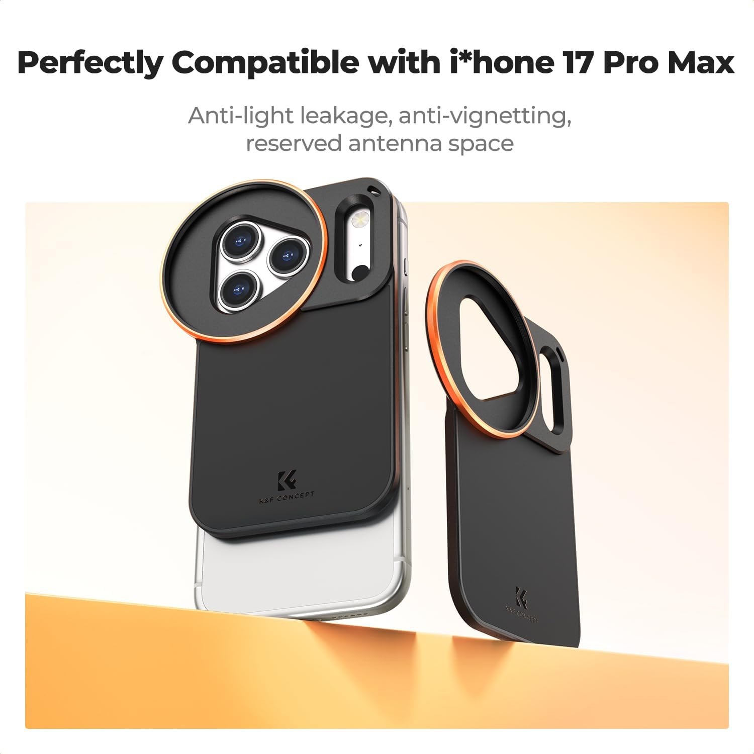Oboustranný magnetický držiak filtra K&F CONCEPT 58 mmje navrhnutý špeciálne pre iPhone 17 Pro Max a ponúka fotografom a tvorcom obsahu profesionálne riešenie pre upevnenie filtra. Je presne navrhnutý tak, aby pasoval na modul objektívu iPhone, má trojuholníkový výrez na objektív a obdĺžnikový otvor Deco, čím zaručuje perfektné uchytenie bez ovplyvnenia fotoaparátu, blesku alebo signálu antény. Veľký otvor na blesk v kombinácii s dutinou antény zabraňuje úniku svetla a rušeniu signálu, čím zachováva plný výkon telefónu.