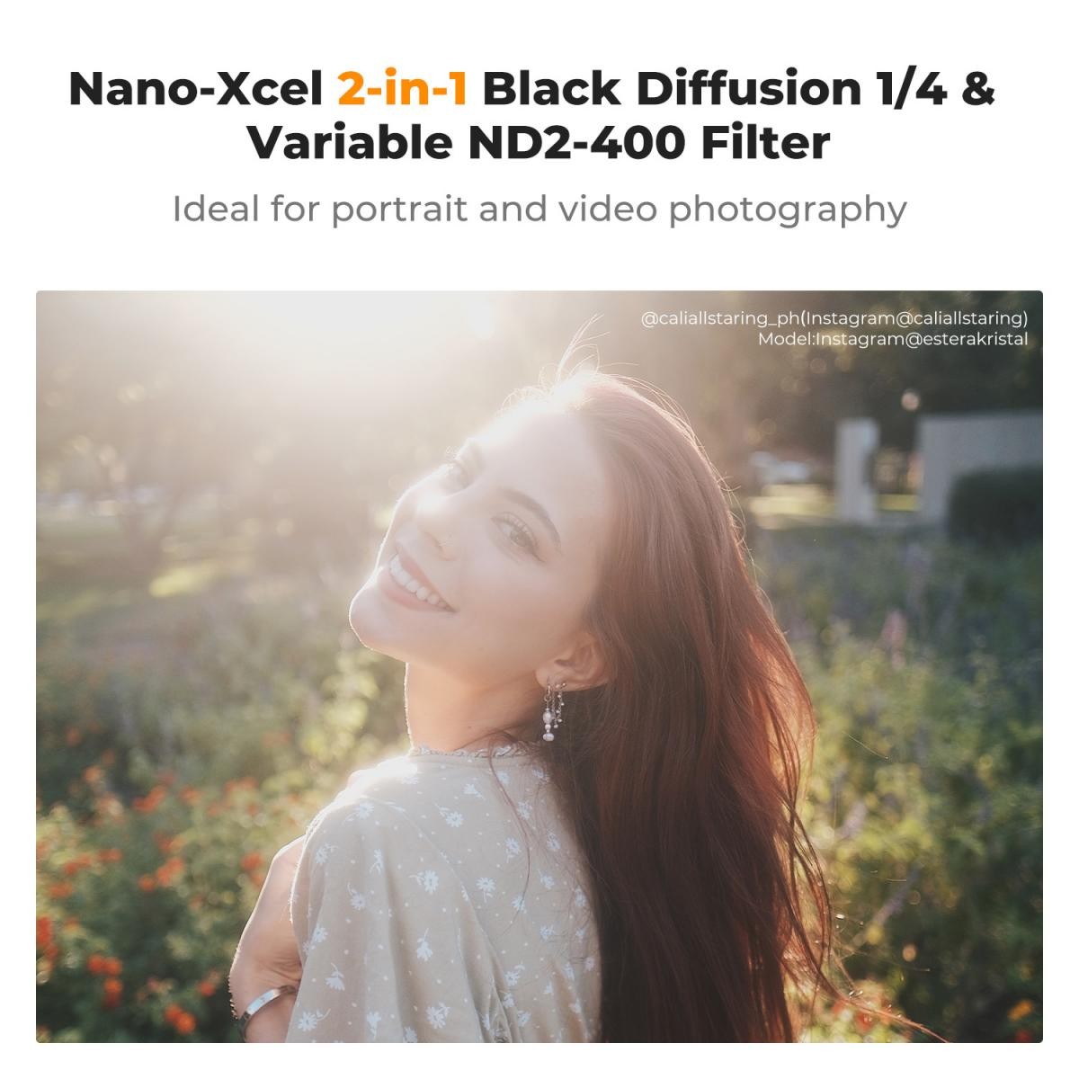 Multifunkčný nastaviteľný čierny filter K&F Concept 62 mm Black Mist 1/4 & Variable ND2–ND400 je vysoko výkonný nástroj 2 v 1 pre fotografovanie aj natáčanie videa. Spája mäkké, žiarivé odlesky a znížený kontrast difúzneho filtra Black Mist 1/4 s flexibilnou kontrolou expozície variabilného ND filtra, nastaviteľného od ND2 do ND400. Systém nastavenia typu putter umožňuje presné ovládanie zastavenia a otáčanie o 360°, čo umožňuje jednoduché nastavenie expozície v reálnom čase pre video alebo kreatívnu fotografiu. Filter je vyrobený z importovaného optického skla AGC s 28 vrstvami obojstranných nano povlakov a poskytuje vysokú ostrosť obrazu, pričom zostáva vodotesný, odolný voči poškriabaniu, oleju a plesni. Technológia samozatváracieho rámu K&F Concept eliminuje krížový vzor „X“, ktorý je bežný u konvenčných variabilných ND filtrov, a to aj na širokouhlých objektívoch. Tento filter je ideálny pre filmové videá, portrétnu fotografiu, krajiny a kreatívne fotografické scenáre, ktoré vyžadujú difúziu aj variabilnú kontrolu ND.