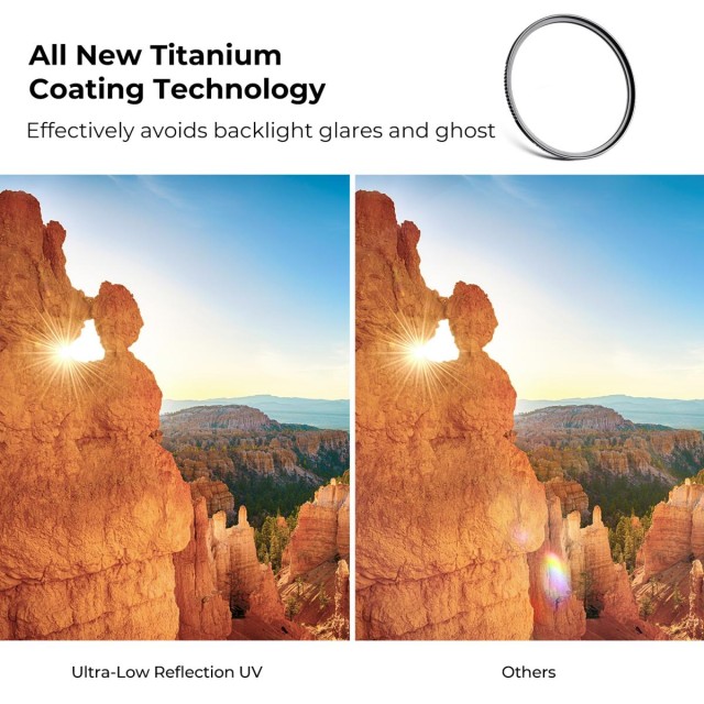 UV filter s veľmi nízkym odrazom. Spoločnosť K&F Concept používa na UV filtri s ultra nízkou reflexiou titánovú povrchovú úpravu, ktorá znižuje povrchovú reflexiu filtra na 0,1 %, čo zlepšuje prenos svetla, účinne zabraňuje odleskom a duchom v protisvetle a zabezpečuje bezchybnú ostrosť.