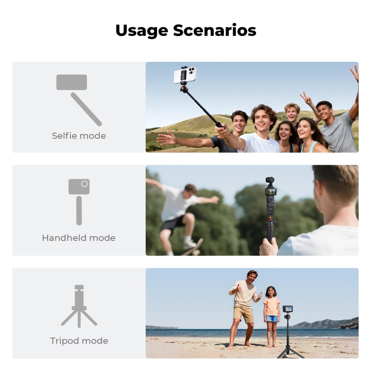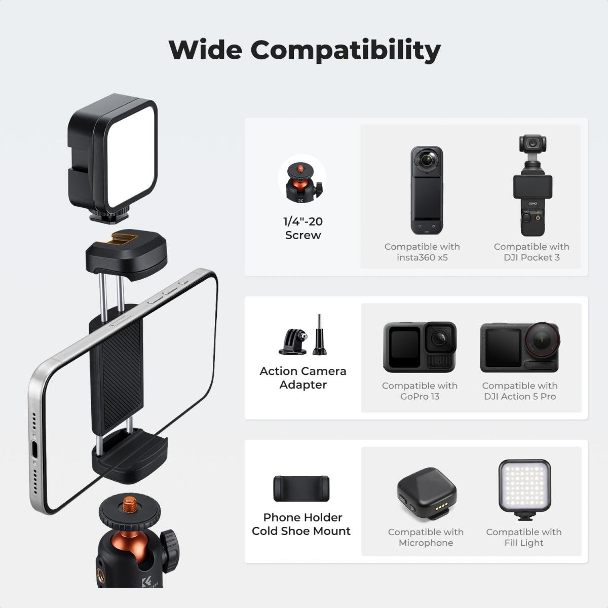 Je vybavený štandardným 1/4" závitom na hlave držiaka, kompatibilným s kompaktnými fotoaparátmi značiek ako Canon a Sony. Súčasťou balenia sú adaptéry pre akčné kamery a držiak na telefón, vďaka čomu je ideálny na použitie s DJI Pocket 3, GoPro, DJI Osmo Action, Insta360, smartfónmi a inými zariadeniami.