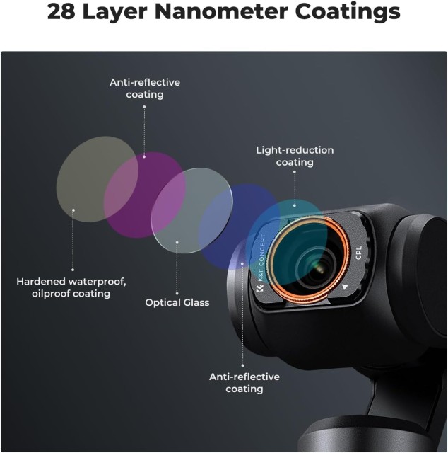 - 【28 viacvrstvových vrstiev optického skla】Každý filter vyrobený z dovážaného optického skla AGC, bez vplyvu na kvalitu obrazu, zabezpečuje obnovenie skutočnej farby obrazu. Dvojitá strana skla prijala viacvrstvovú povrchovú úpravu, ktorá pomáha odpudzovať vodu, prach, mastnotu a zabraňuje poškriabaniu. Ľahko sa čistí a udržiava a chráni objektív Osmo pocket 3 pred všadeprítomnými vplyvmi.