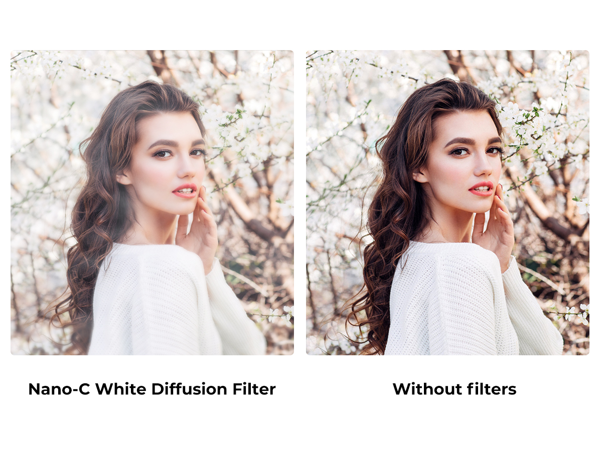 * 【Zníženie ostrosti a zjemnenie tónu】 Mäkký biely filter robí obraz jemným, ľahkým a priehľadným a môže tiež znížiť kontrast a sýtosť obrazu, čím vytvára svieži a zasnený vizuálny efekt