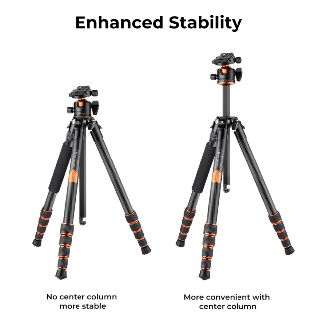 V porovnaní s tradičnými statívmi pre fotoaparáty je statív K&F Concept A255C2+BH-35L vybavený špeciálnym stredovým stĺpikom, ktorý znižuje objem statívu o 30 %. Ľahko sa prenáša jednou rukou.