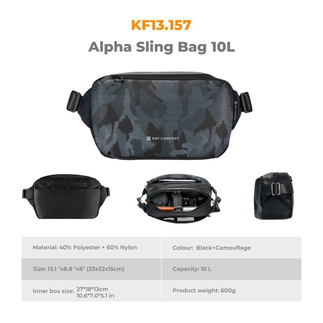 * s veľkosťou 33*22*15cm / 13,1"*8,8"*6", K&F Concept Alpha Camera Sling Bag má kapacitu 10L a ľahko pojme jeden fotoaparát a dva objektívy. Vďaka svojej všestrannej funkcii sa táto taška na fotoaparát môže používať ako taška cez rameno, crossbody taška, taška na opasok, náprsná taška alebo kabelka.