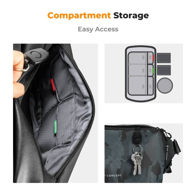 * 【Dobre organizované priehradky】Taška na fotoaparát K&F Concept Alpha Sling Bag má až 3 vrstvy priehradiek, do ktorých môžete oddelene uložiť fotoaparáty, príslušenstvo a osobné veci. Čisté, dobre organizované a ľahko prístupné ku každej položke.